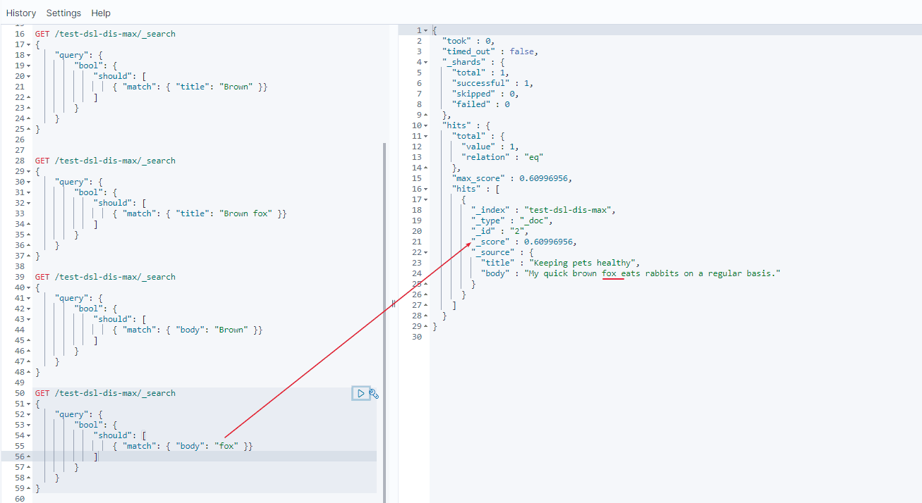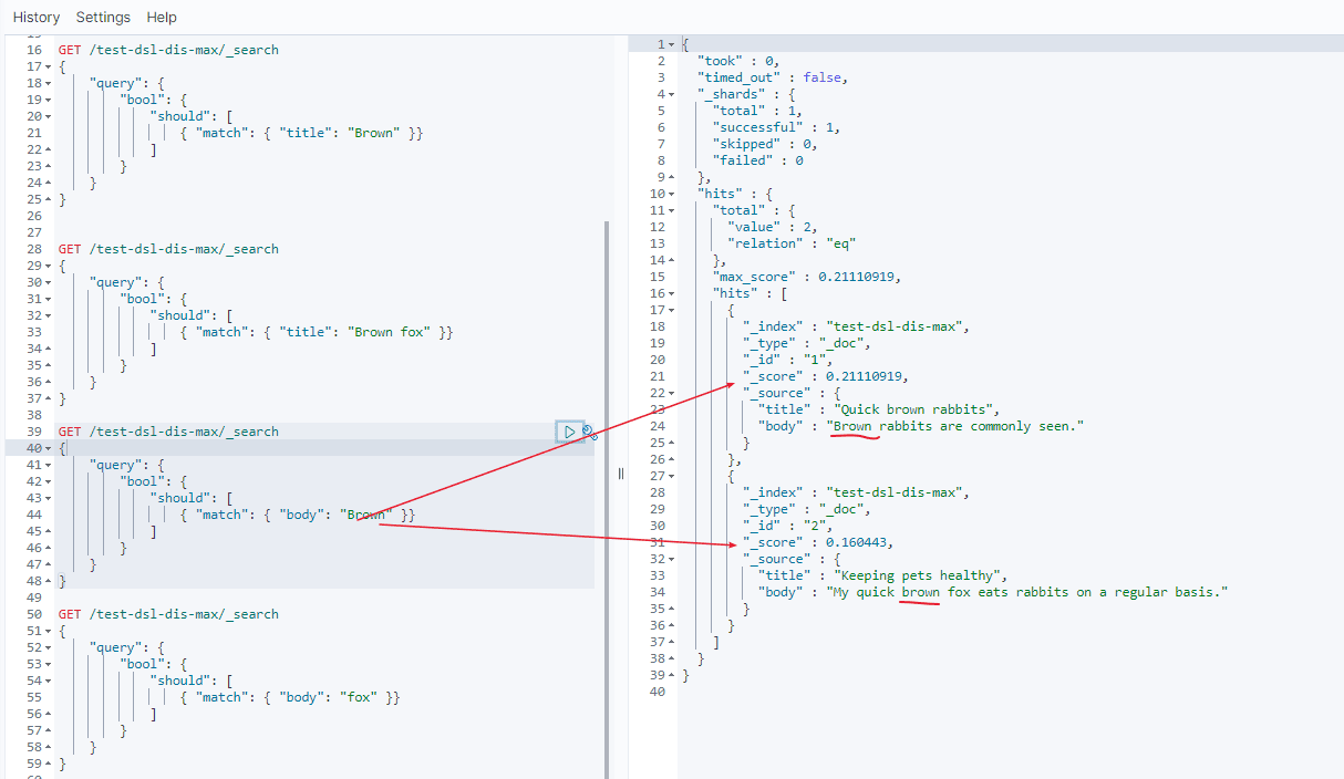{"title": "Keeping pets healthy","body": "My quick brown fox eats rabbits on a regular basis."}用户输入词组 “Brown fox” 然后点击搜索按钮。事先,我们并不知道用户的搜索项是会在 title 还是在 body 字段中被找到,但是,用户很有可能是想搜索相关的词组。用肉眼判断,文档 2 的匹配度更高,因为它同时包括要查找的两个词: