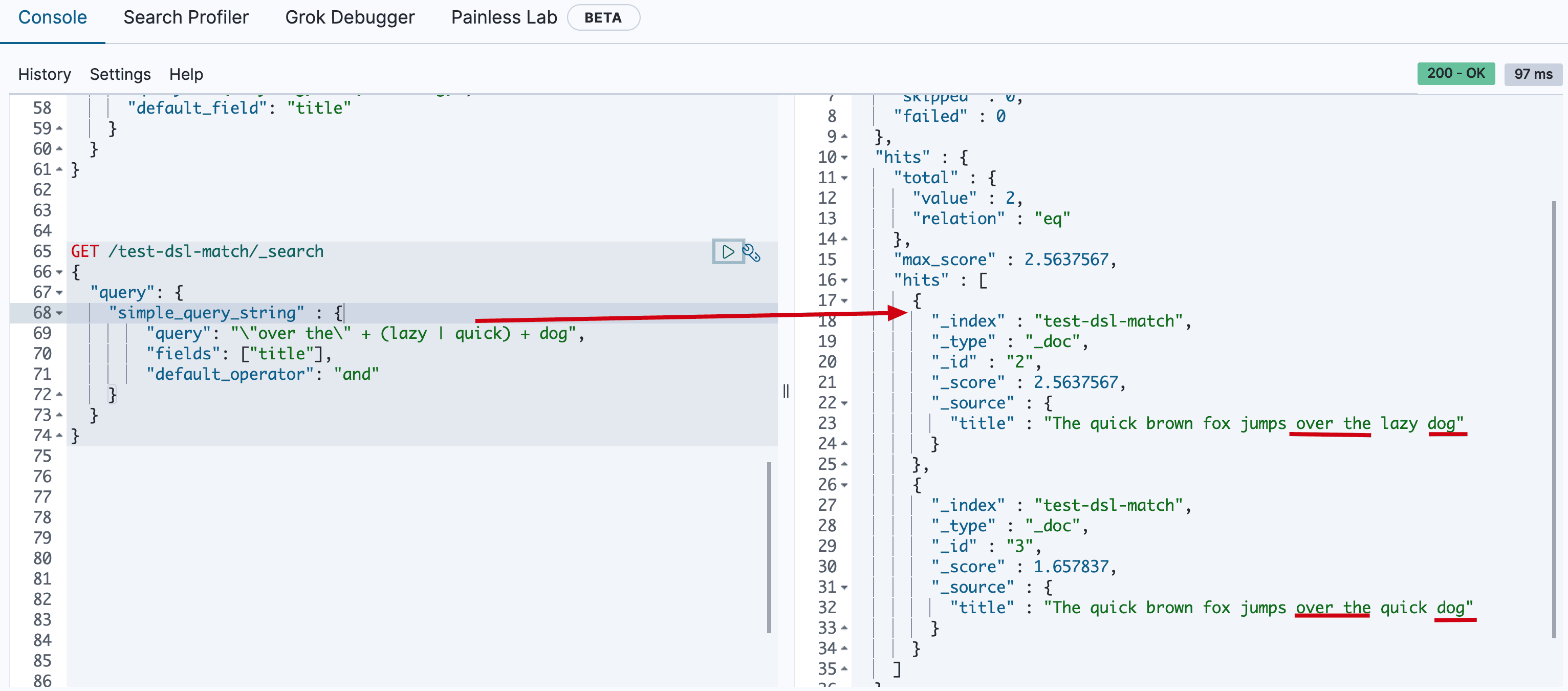 "query": "\"over the\" + (lazy | quick) + dog",