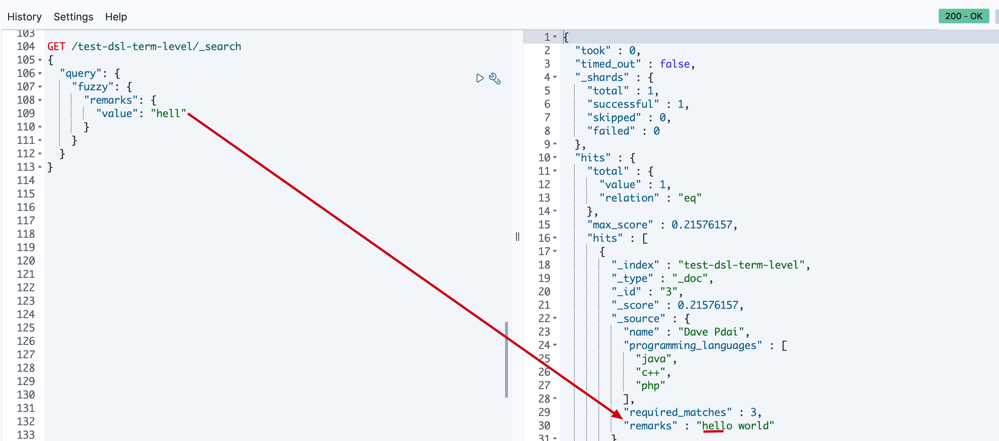 官方文档对模糊匹配:编辑距离是将一个术语转换为另一个术语所需的一个字符更改的次数。这些更改可以包括:
