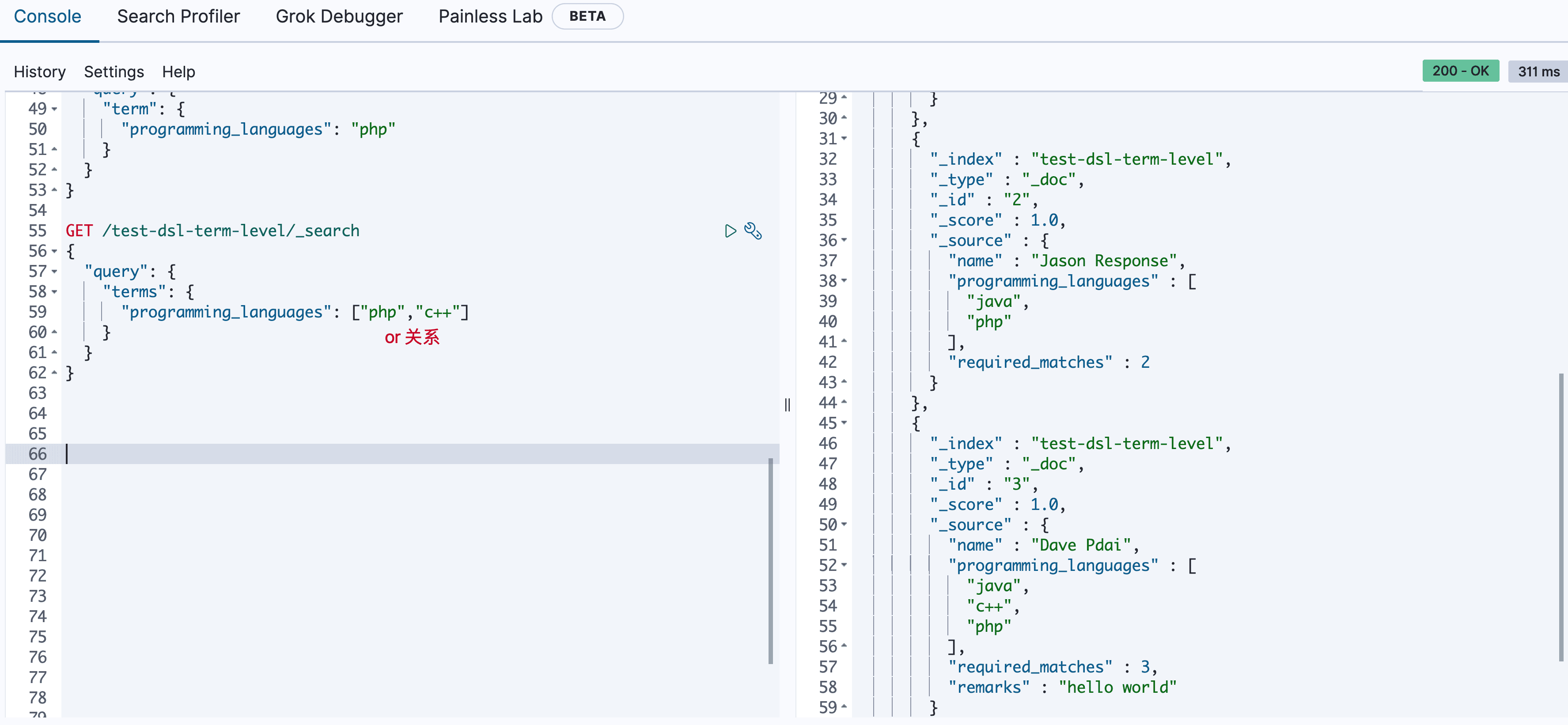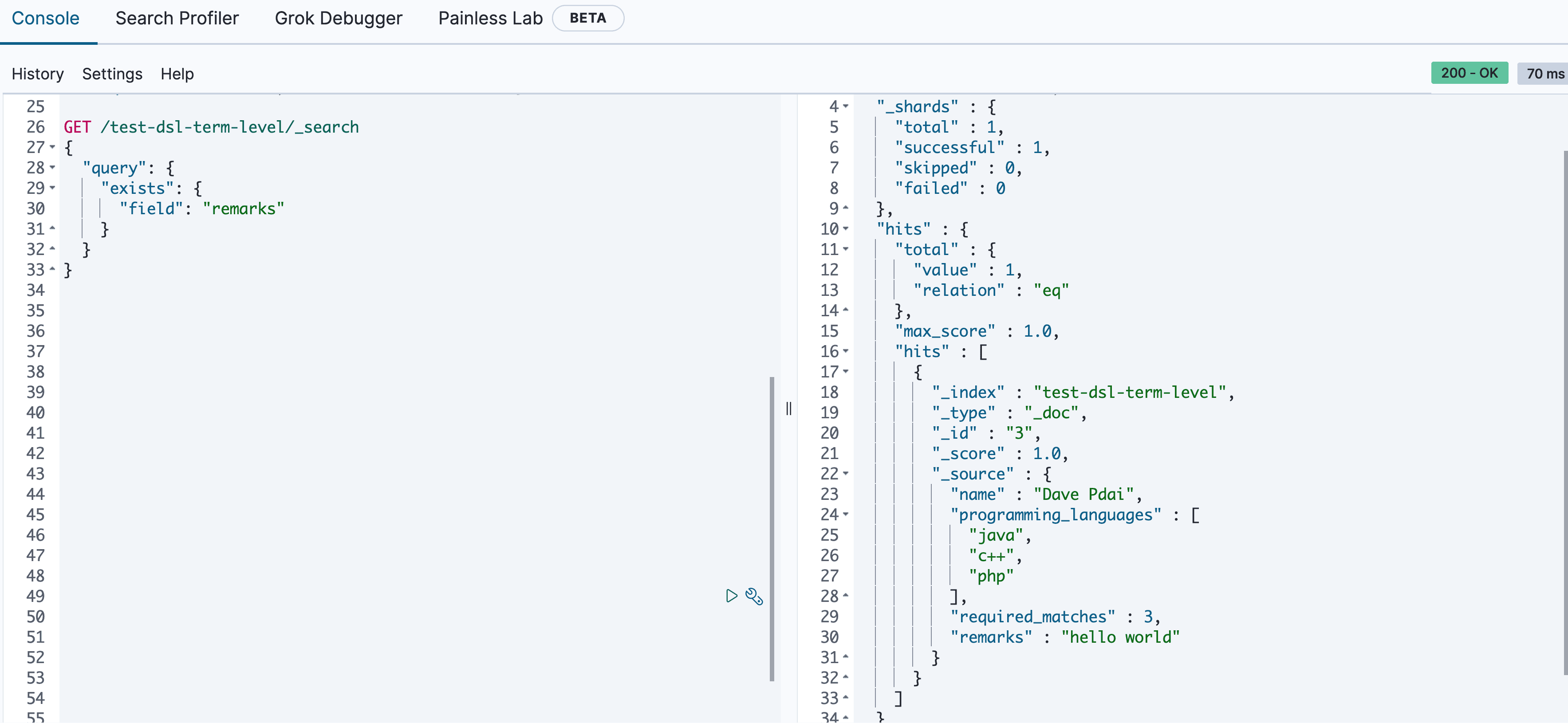 {"name": "Dave Anarkh", "programming_languages": [ "java", "c++", "php" ], "required_matches": 3, "remarks": "hello world"}字段是否存在:exist