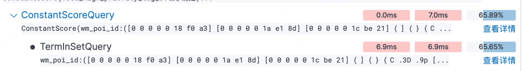 - 此外在 Elasticsearch 中还可以通过 Kibana 的 Search Profiler 用于协助定位问题。在录制大量的流量,抽样分析后,以我们的场景为例,进行 Profiler 后可以明确 TermInSetQuery 占用了一半以上的耗时。