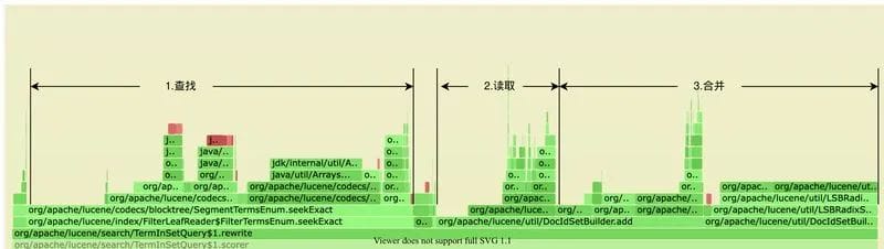 Lucene在不同场景上使用了不同的倒排格式,提高整体的效率(空间/时间),通过火焰图可以发现,在我们的场景上,TermInSetQuery 的倒排合并逻辑开销最大。