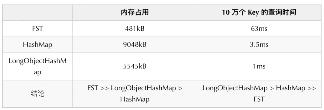- 在查询时间上 :FST 的查询复杂度在 O (len(term)),而 Hash/LongObjectHashMap 有着 O(1) 的查询性能;