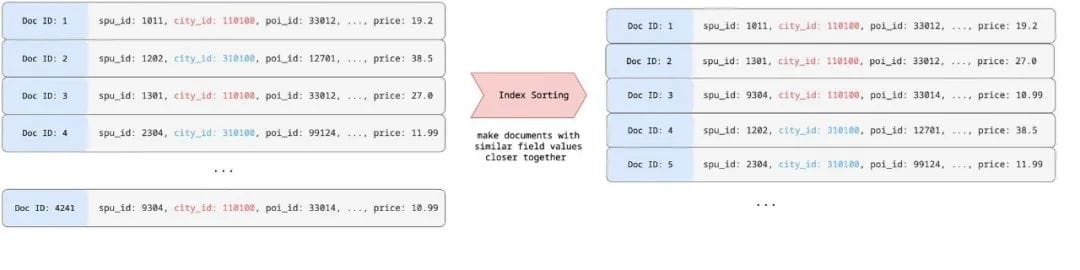 Elasticsearch 从 6.0 版本开始支持 Index Sorting[5] 功能,在索引阶段可以配置多个字段进行排序,调整索引数据组织方式,可以调整文档所对应的 Doc ID。以 city_id,poi_id 为例: