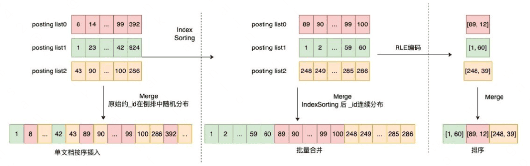 - 选取 RoaringBitmap 作为存储倒排链的数据结构,并与 RLE Container 相结合,实现对倒排链的压缩存储。当然,最重要的是,RLE 编码将倒排链的合并问题转换成了排序问题,实现了批量合并,从而大幅度减少了合并的性能消耗。