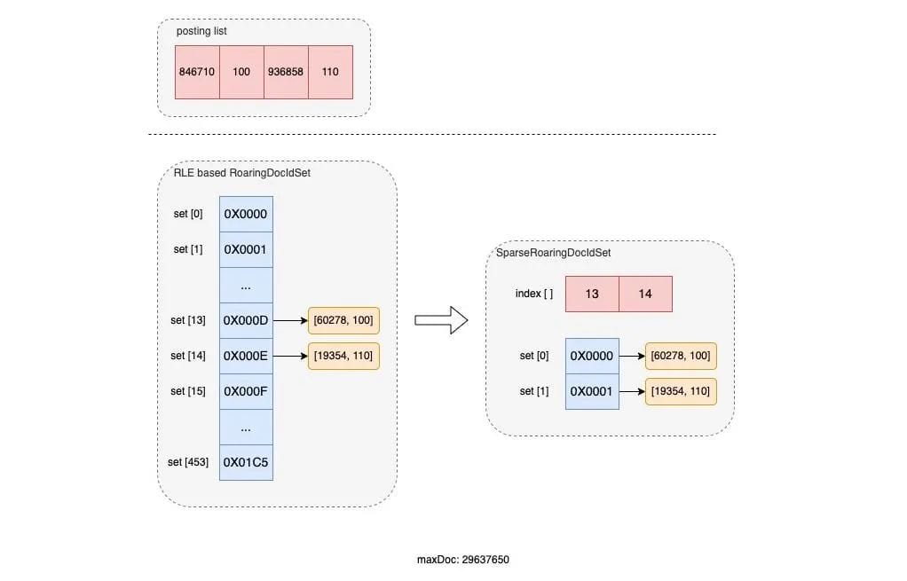 可以看到:在 SparseRoaringDocIdSet 实现下,所有不为空的 bucket 被紧密的排列在了一起,并在 index [] 中记录了其原始 bucket 的索引,这就避免了大量 bucket 被空置的情况。另外,在进行倒排链的合并时,就可以直接对紧密排列的 denseSet 进行遍历,并从 index [] 获得其对应的原始 bucket location,这就避免了大量的空置 bucket 在合并时带来的性能浪费。