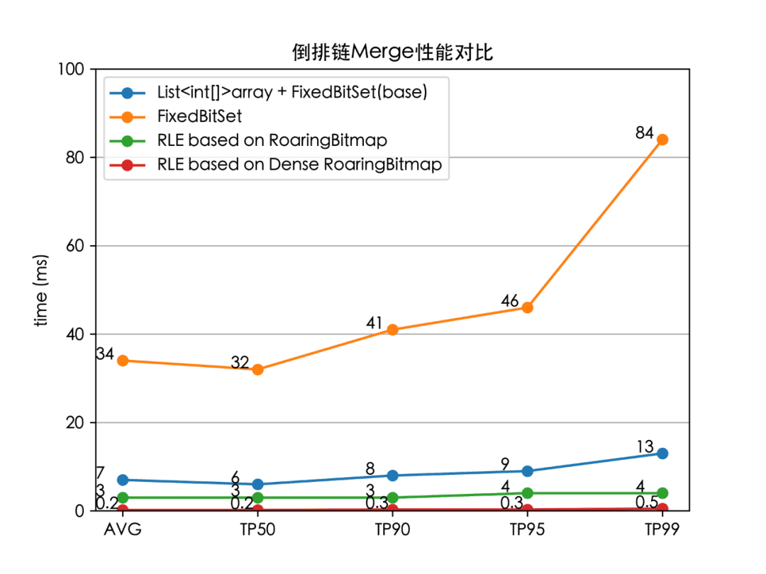 List<int[]> array方式存储 Doc ID,最终经过 Merge 和排序形成一个有序数组 int[],耗时主要集中在数组申请和排序。 - 稠密数据:基于 long[] 实现的 bitmap 结构(FixedBitSet),耗时主要集中在 FixedBitSet 的插入过程,由于倒排链需要实时 Decode 以及 FixedBitSet 的底层实现,无法实现批量 Merge,只能循环单个 Doc ID 插入,数据量大的情况下,耗时明显。