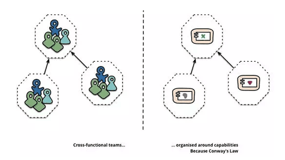 微服务的团队间应该是 inter-operate, not integrate 。 inter-operate 是定义好系统的边界和接口,在一个团队内全栈,让团队自治,原因就是因为如果团队按照这样的方式组建,将沟通的成本维持在系统内部,每个子系统就会更加内聚,彼此的依赖耦合变弱,跨系统的沟通成本也就能减低。