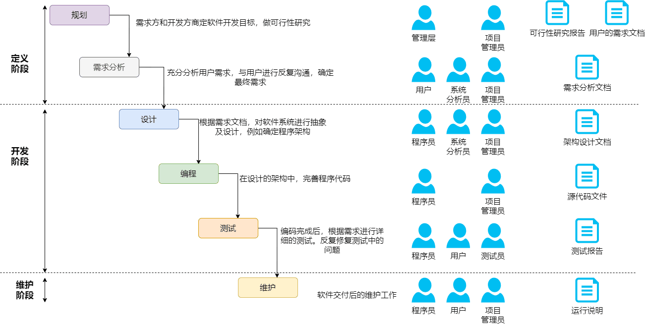 - 让分工协作变成可能。瀑布模型的六个阶段,也让软件开发产生相应的基础分工:项目经理、产品经理、架构师、软件工程师、测试工程师、运维工程师。