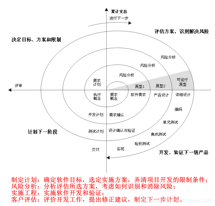 螺旋模型采用一种周期性的方法来进行系统开发。这会导致开发出众多的中间版本。使用它,项目经理在早期就能够为客户实证某些概念。该模型是快速原型法,以进化的开发方式为中心,在每个项目阶段使用瀑布模型法。这种模型的每一个周期都包括需求定义、风险分析、工程实现和评审 4 个阶段 ,由这 4 个阶段进行迭代 。软件开发过程每迭代一次,软件开发又前进一个层次。采用螺旋模型的软件过程如下图所示: