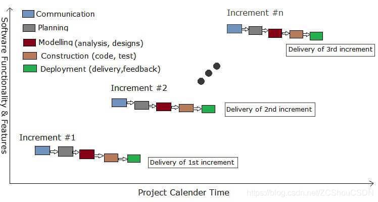 当使用增量模型时,第 1 个增量往往是核心的产品,即第 1 个增量实现了基本的需求,但很多补充的特征还没有发布。客户对每一个增量的使用和评估都作为下一个增量发布的新特征和功能,这个过程在每一个增量发布后不断重复,直到产生了最终的完善产品。增量模型强调每一个增量均发布一个可操作的产品。采用增量模型的软件过程如下图所示: