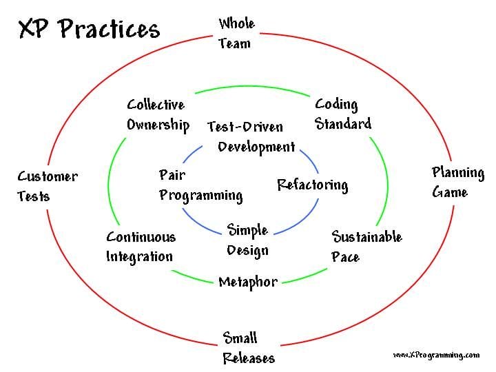 XP实践包含三个闭环的圈,最里面的环围绕个人如何编码和设计;中间的环围绕作为团队如何协作编码和集成;最外围的环面对客户如何协作、计划和交付。