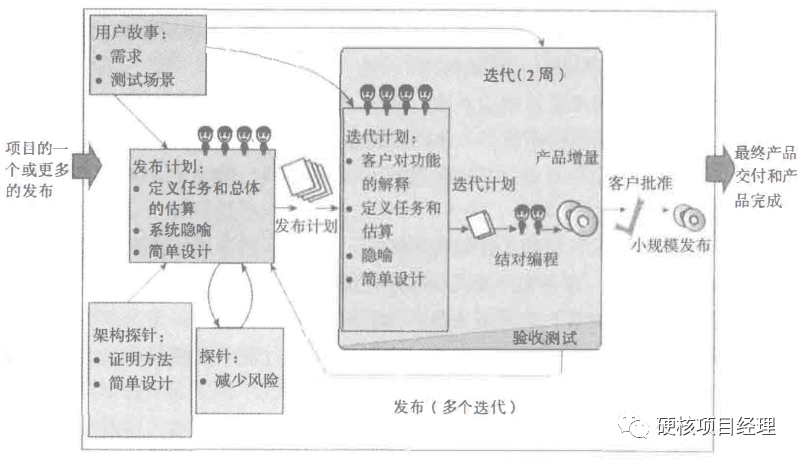上述几个步骤,就是一个 XP 项目开发的整个生命周期过程,完整的产品最后就是通过这样不停地迭代实现的。在图中,我们还看到了 架构探针 和 探针 这两个东西。其实,它们是为了些特殊情况而使用的,比如说采用了新的技术、或者使用了新的架构、或者我们第一次尝试 XP 开发。这个时候,一个探针就像是一次测试的微型迭代。探针 是为了减少风险的,并且可能在整个项目开发中经常会使用到。