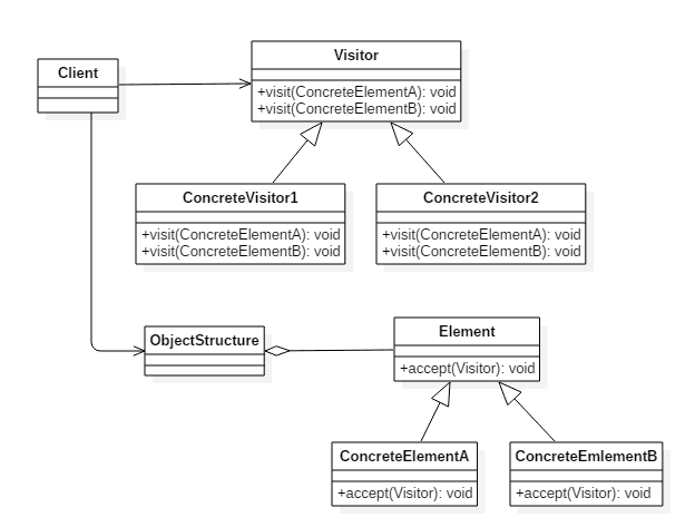 - ObjectStructure: 对象结构,可以是组合结构,或者是一个集合。
