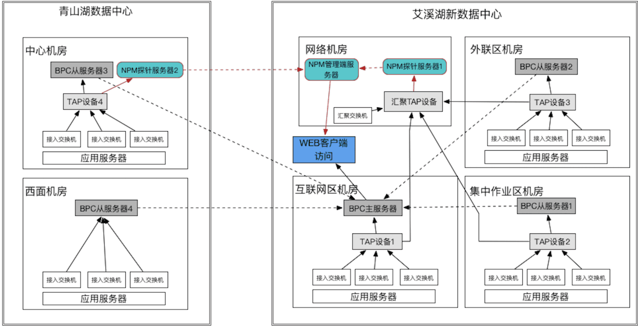 - (5)NPM系统在艾溪湖数据中心部署一台管理端服务器,并在每个数据中心各部署一台NPM探针服务器,通过分布式部署、捕获数据,集中监控展示的方式,监控两个数据中心的各业务系统的网络性能;