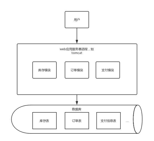 这时候仍然是垂直架构,所有业务集中在一个项目里。项目维护、快速迭代问题会越来越严重,单个模块的开发都需要发布整个项目,项目稳定性也受到很大挑战,这是需要考虑业务的垂直拆分,需要将一些大的模块单独拆出来,这时候的架构图如下: