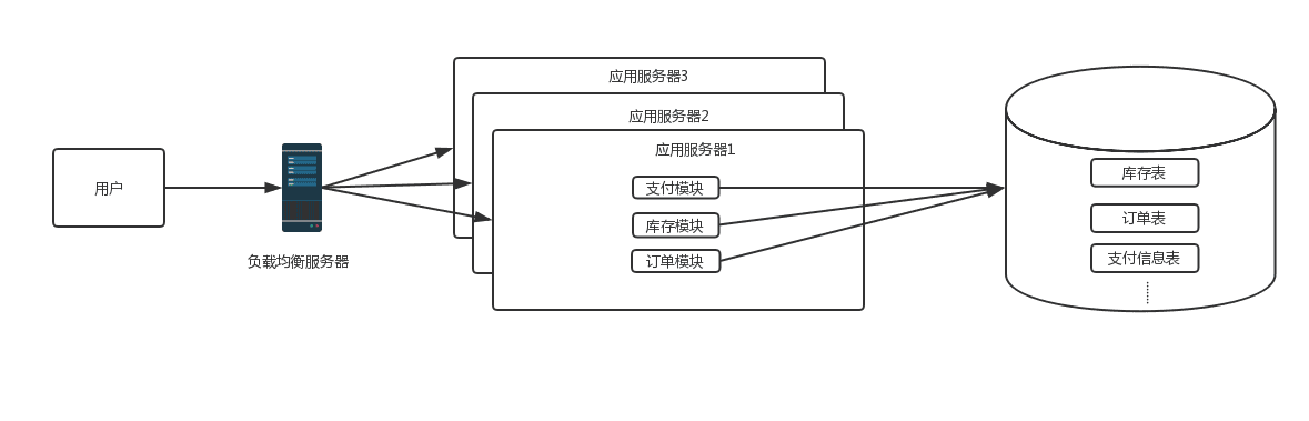 这个时候是一个web项目里包含了所有的模块,一个数据库里包含了所需要的所有表,这时候网站访问量增加时,首先遇到瓶颈的是应用服务器连接数,比如tomcat连接数不能无限增加,线程数上限受进程内存大小、CPU内核数等因素影响,当线程数到达一定数时候,线程上下文的切换对性能的损耗会越来越严重,响应会变慢,通过增加web应用服务器方式的横向扩展对架构影响最小,这时候架构会变成下面这样: