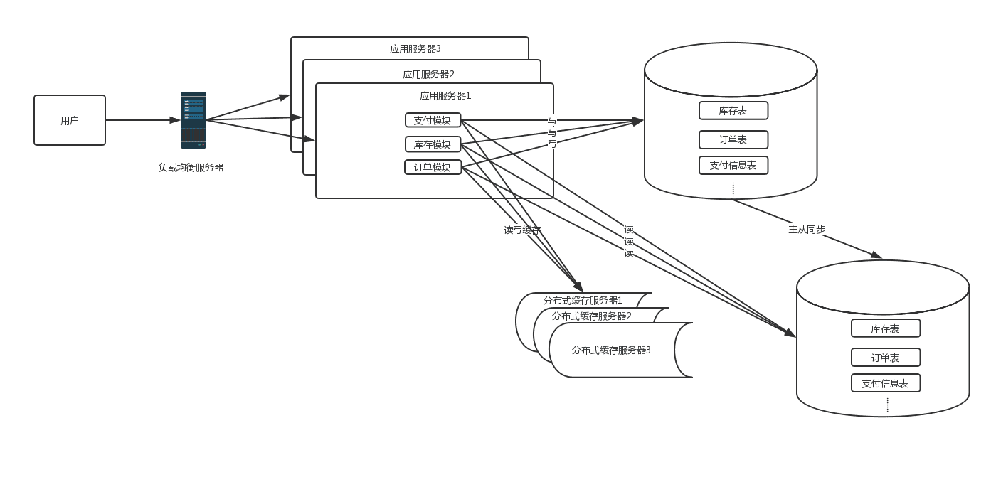 这时,根据业务特点,如果读写比差距不大,并且对数据一致性要求不是很高的情况下,数据库可以采用主从方式进行读写分离的方案,并且引入缓存机制来抗读流量。如果读写比差距很大或者对数据一致性要求高时,就不适合用读写分离方案,需要考虑业务的垂直拆分,这时期的系统架构图如下: