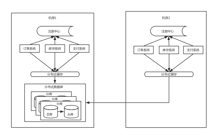 随着流量的进一步增大,这时候系统仍然会有瓶颈出现,以订单系统为例: 单个机房的机器是有限的,不能一直新增下去,并且基于容灾的考虑,一般采用同城双机房的方式,机房之间用专线链接,同城跨机房质检的延时在几毫秒,此时的架构图如下: