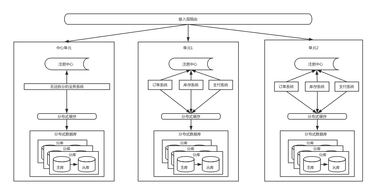 从上面的架构图里能看到,流量从接入层按照路由规则(比如以用户ID来路由)路由到不同单元,每个单元内都是高内聚,包含了核心系统,数据层面的分片逻辑是与接入层路有逻辑一致,也解决了数据库连接的瓶颈问题,但是一些跨单元的调用是无法避免的,同时也有些无法拆分的业务需要放在中心单元,供所有其他单元调用。