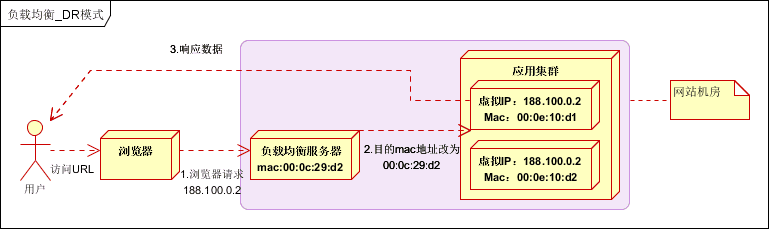实际处理服务器ip和数据请求目的ip一致,不需要经过负载均衡服务器进行地址转换,可将响应数据包直接返回给用户浏览器,避免负载均衡服务器网卡带宽成为瓶颈。也称为直接路由模式(DR模式)。如下图: