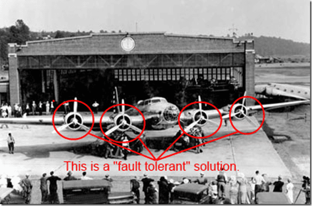 举例:飞机有四个引擎,如果一个引擎坏了,剩下三个引擎,还能继续飞,这就是"容错"。同样的,汽车的一个轮子扎破了,剩下三个轮子,也还是勉强能行驶。