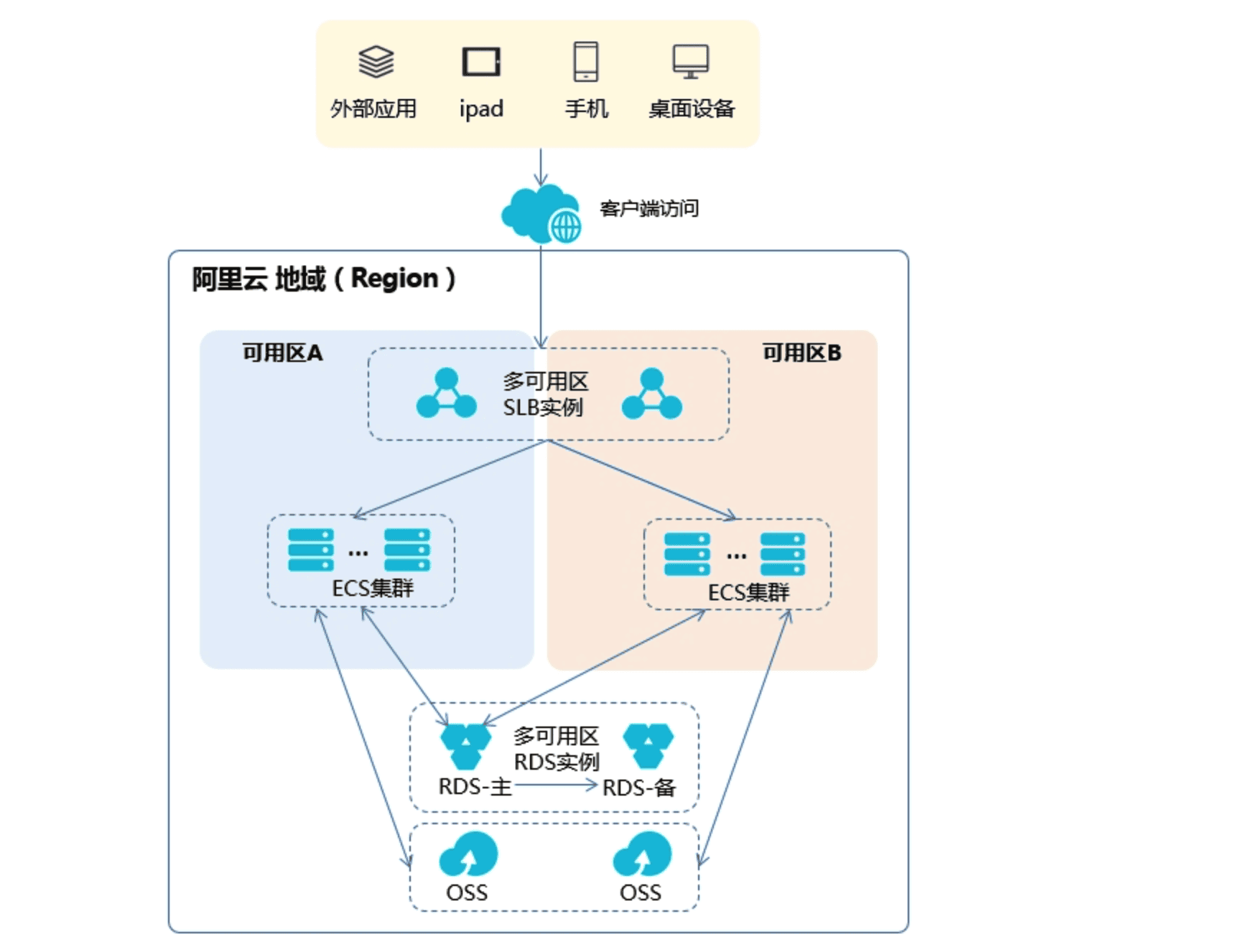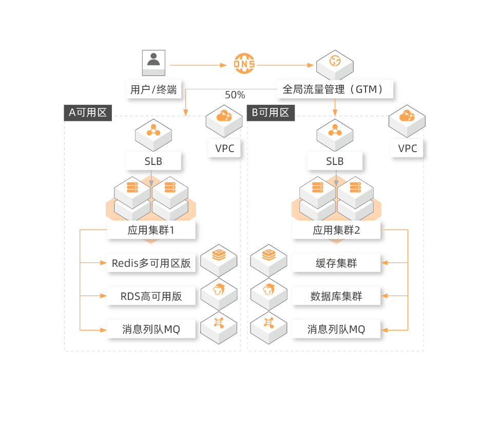 - 数据层 :在地域级别部署对象存储,不同可用区机房的ECS节点可以直接读取文件信息。若是数据库应用,使用多可用区ApsaraDB for RDS服务做承载,主节点支持多可用区读写,与应用层流量来源无冲突关系。同时,备节点支持多可用区读能力,防止主节点故障时,ECS无法读取数据。