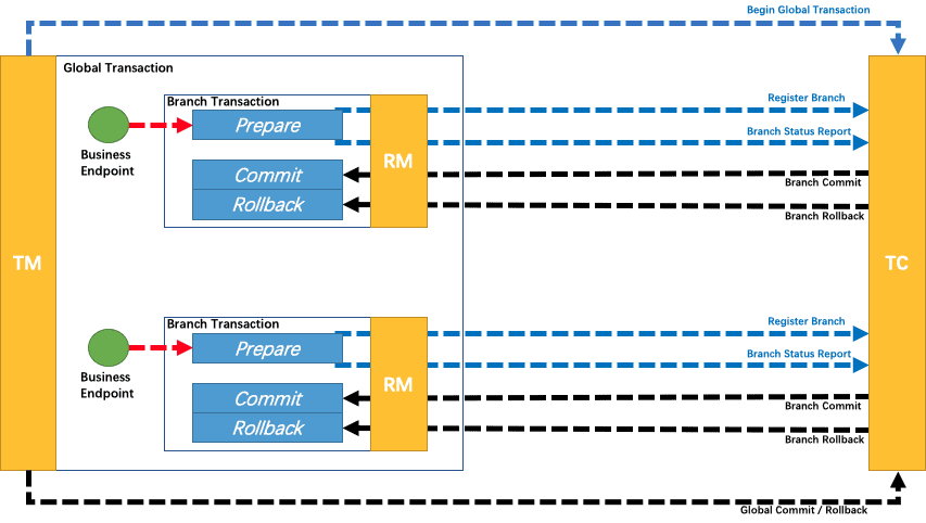 根据两阶段行为模式的不同,我们将分支事务划分为 Automatic (Branch) Transaction Mode 和 TCC (Branch) Transaction Mode.