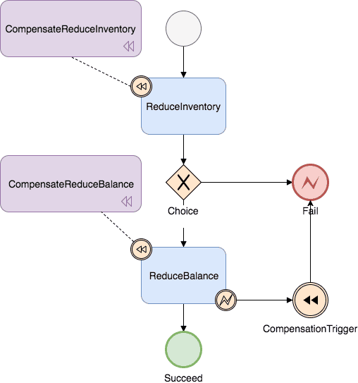 - 状态图中一个节点可以是调用一个服务,节点可以配置它的补偿节点