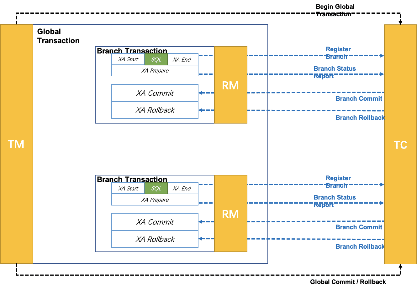 XA协议 是一个基于数据库层面的分布式事务协议,其分为两部分:事务管理器(Transaction Manager)和 本地资源管理器(Resource Manager)。事务管理器作为一个全局的调度者,负责对各个本地资源管理器统一号令提交或者回滚。主流的诸如Oracle、MySQL等数据库均已实现了XA接口。