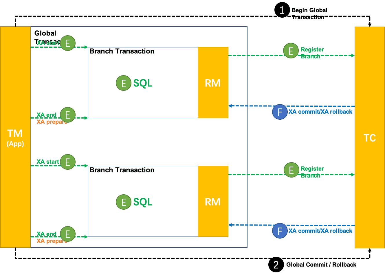 - 持久化:XA 分支完成后,执行 XA prepare,同样,由资源对 XA 协议的支持来保证 持久化(即,之后任何意外都不会造成无法回滚的情况)