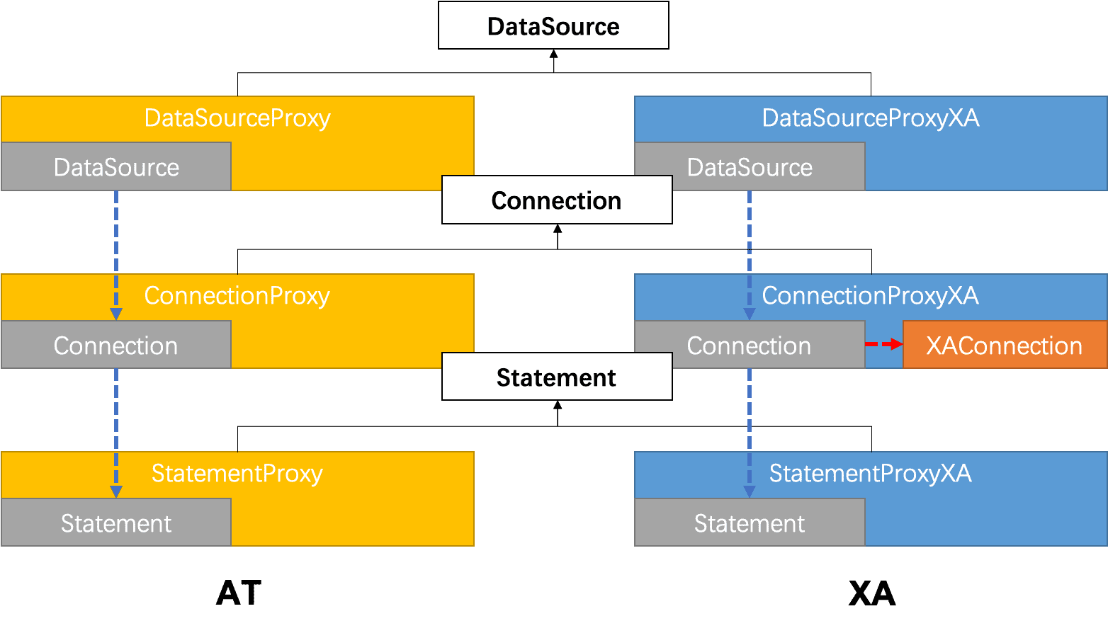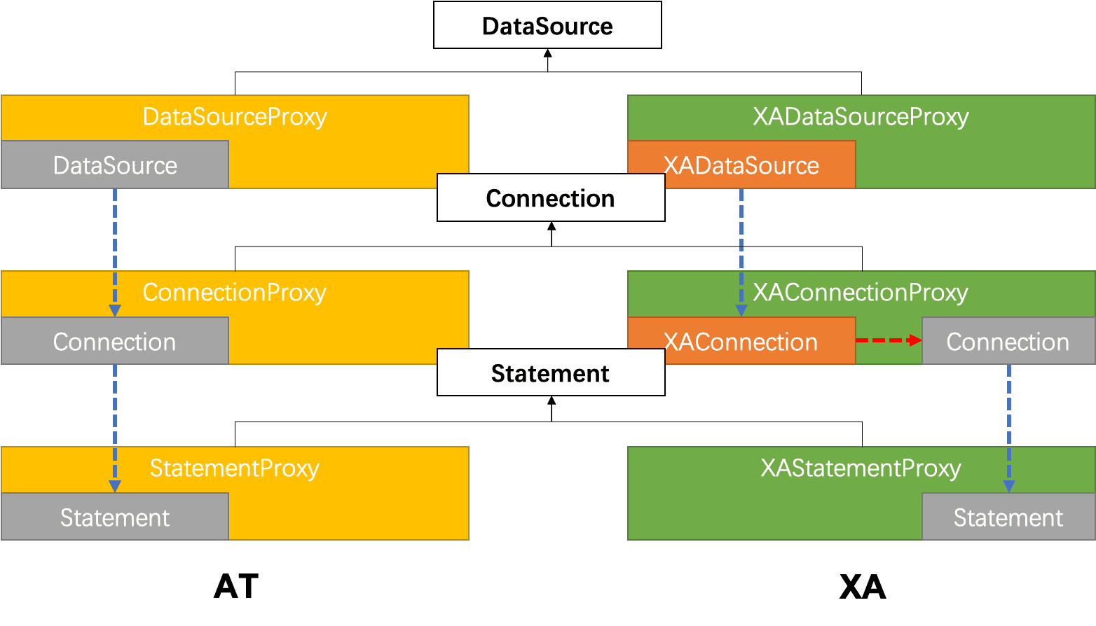 综合考虑,XA 模式的数据源代理设计需要同时支持第一种方式:基于 XA 数据源进行代理。