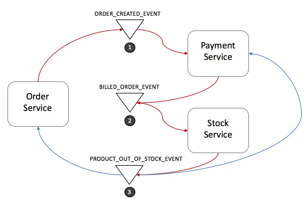 在基于事件的方式中,第一个服务执行完本地事务之后,会产生一个事件。其它服务会监听这个事件,触发该服务本地事务的执行,并产生新的事件。
