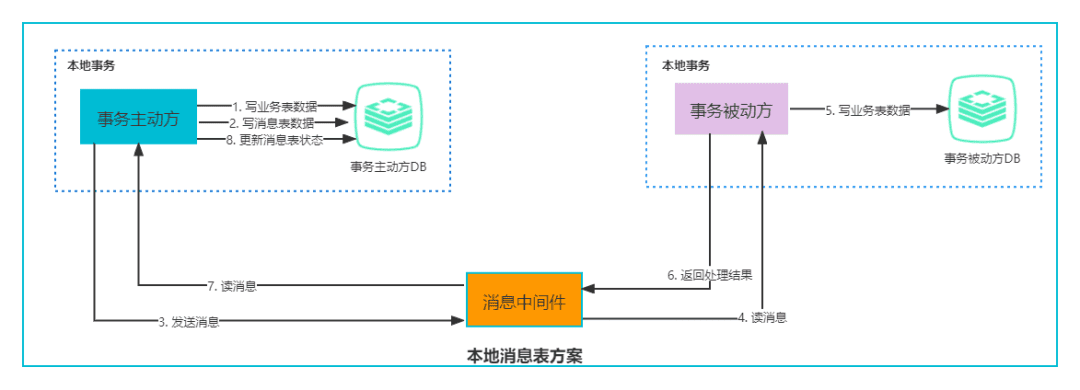 消息表 :本地消息表的方案最初是由 eBay 提出,核心思路是将分布式事务拆分成本地事务进行处理。