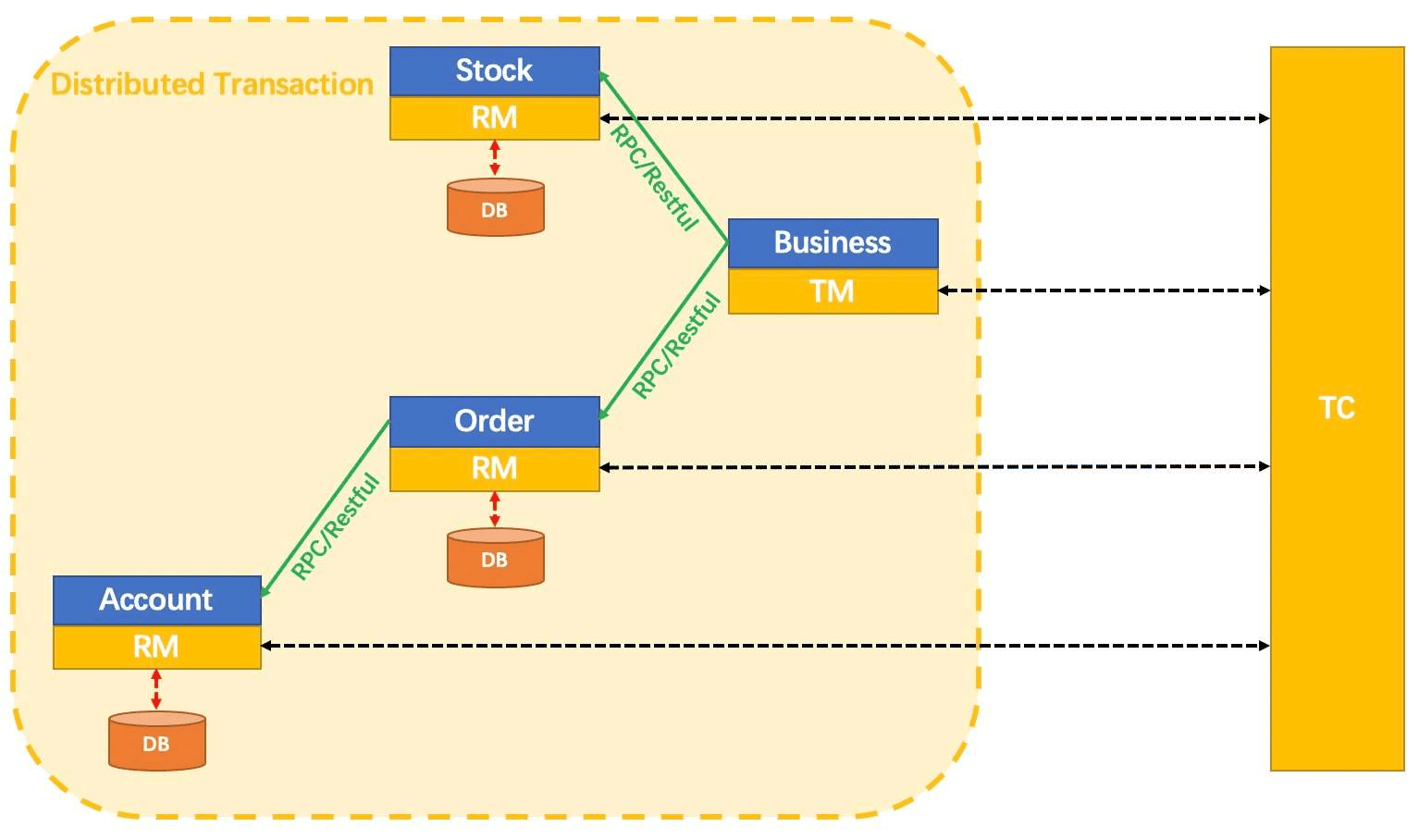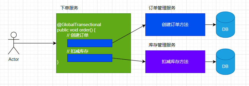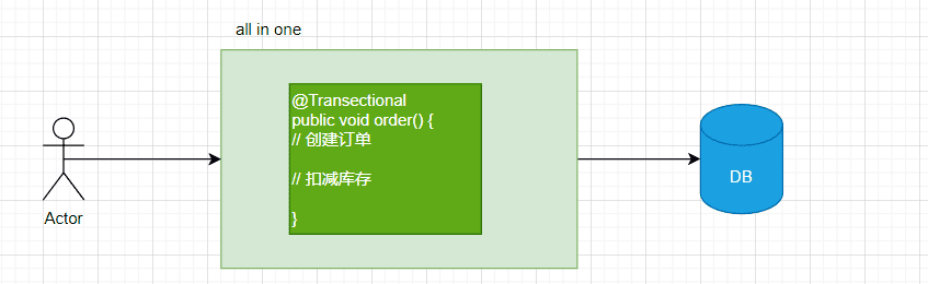 单体应用所有的业务都使用一个数据库,整个下单流程或许只用在一个方法里同一个事务下操作数据库即可。此时所有操作都在一个事务里,要么全部提交,要么全部回滚。
