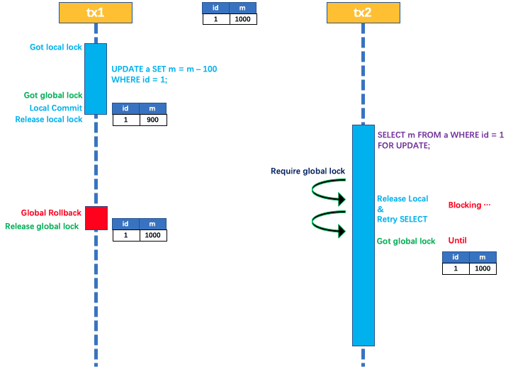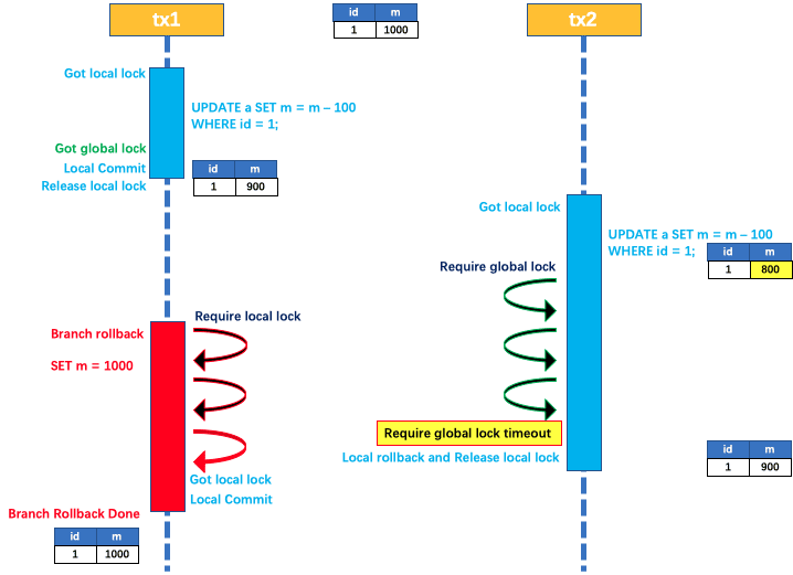 tx1 先开始,开启本地事务,拿到本地锁,更新操作 m = 1000 - 100 = 900。本地事务提交前,先拿到该记录的 全局锁 ,本地提交释放本地锁。 tx2 后开始,开启本地事务,拿到本地锁,更新操作 m = 900 - 100 = 800。本地事务提交前,尝试拿该记录的 全局锁 ,tx1 全局提交前,该记录的全局锁被 tx1 持有,tx2 需要重试等待 全局锁 。