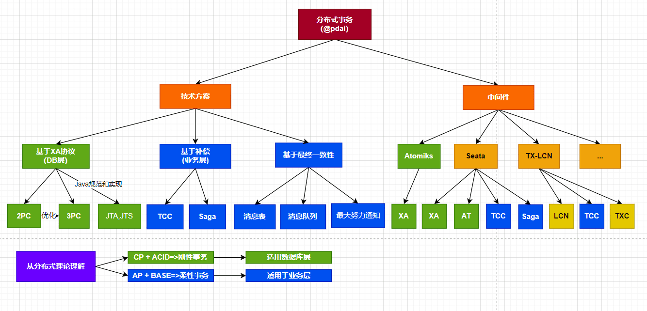 我在梳理这个体系时,发现网上几乎都直接写2PC,3PC,TCC,Seata方案,而实际上这是不成体系的。从分布式事务的体系看,我认为至少应该理清楚,什么是技术方案,什么是中间件,以及形成这些方案的依据;以此,我画了如下的图。@anarkh