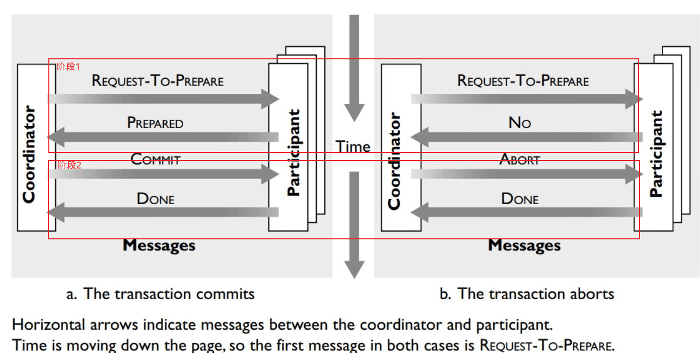 - 协调者收集所有参与者的返回消息, 如果所有的参与者都回复的是PREPARED, 那么协调者向所有参与者发送COMMIT 消息;否则,协调者向所有回复PREPARED的参与者发送ABORT消息;
