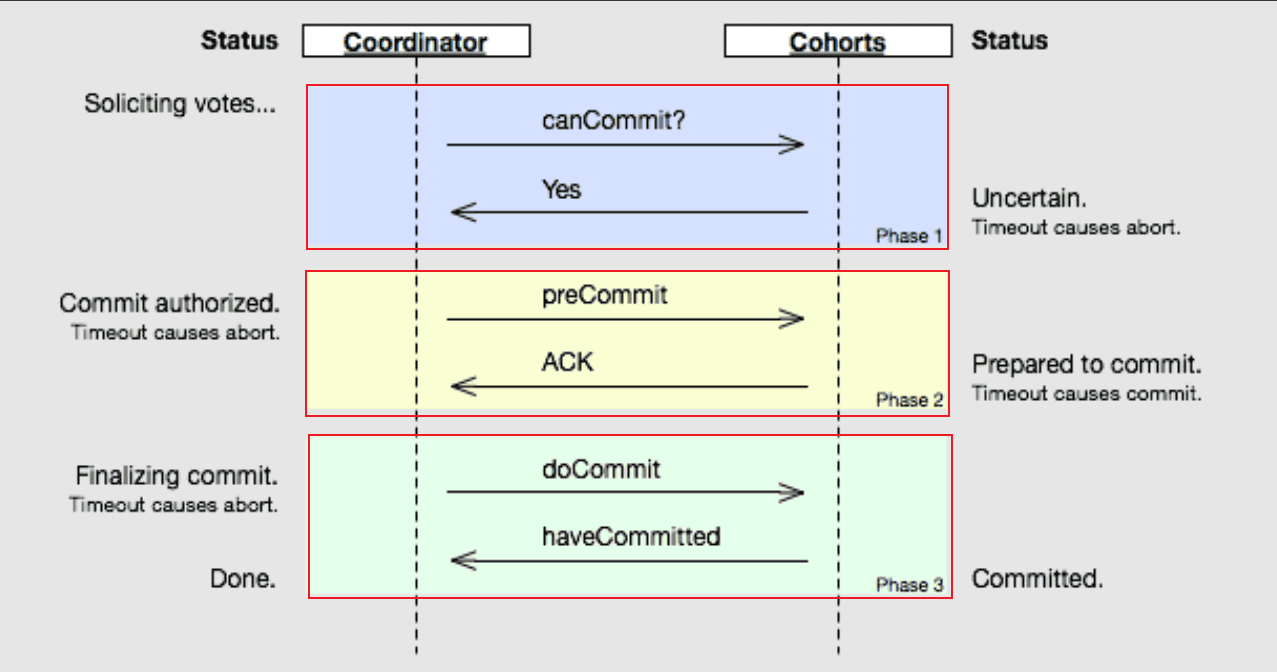 - DoCommit :在前两个阶段中所有参与者的响应反馈均是YES后,协调者向参与者发送DoCommit命令正式提交事务,如协调者没有接收到参与者发送的ACK响应,会向所有参与者发送abort请求命令,执行事务的中断。
