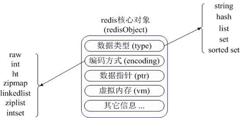 图9左边的raw列为对象的编码方式:字符串可以被编码为raw(一般字符串)或Rint(为了节约内存,Redis会将字符串表示的64位有符号整数编码为整数来进行储存);列表可以被编码为ziplist或linkedlist,ziplist是为节约大小较小的列表空间而作的特殊表示;集合可以被编码为intset或者hashtable,intset是只储存数字的小集合的特殊表示;hash表可以编码为zipmap或者hashtable,zipmap是小hash表的特殊表示;有序集合可以被编码为ziplist或者skiplist格式,ziplist用于表示小的有序集合,而skiplist则用于表示任何大小的有序集合。
