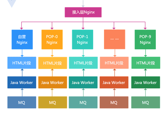 随着商品数量的增加这种架构的存储容量到达了瓶颈,而且按照商品维度生成整个页面会存在如分类维度变更就要全部刷一遍这个分类下所有信息的问题,因此我们又改造了一版按照尾号路由到多台机器。