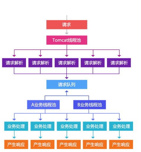 可降级的业务线程池隔离,从Servlet3开始支持异步模型,Tomcat7/Jetty8开始支持,相同的概念是Jetty6的Continuations。我们可以把处理过程分解为一个个的事件。通过这种将请求划分为事件方式我们可以进行更多的控制。如,我们可以为不同的业务再建立不同的线程池进行控制:即我们只依赖tomcat线程池进行请求的解析,对于请求的处理我们交给我们自己的线程池去完成;这样tomcat线程池就不是我们的瓶颈,造成现在无法优化的状况。通过使用这种异步化事件模型,我们可以提高整体的吞吐量,不让慢速的A业务处理影响到其他业务处理。慢的还是慢,但是不影响其他的业务。我们通过这种机制还可以把tomcat线程池的监控拿出来,出问题时可以直接清空业务线程池,另外还可以自定义任务队列来支持一些特殊的业务。