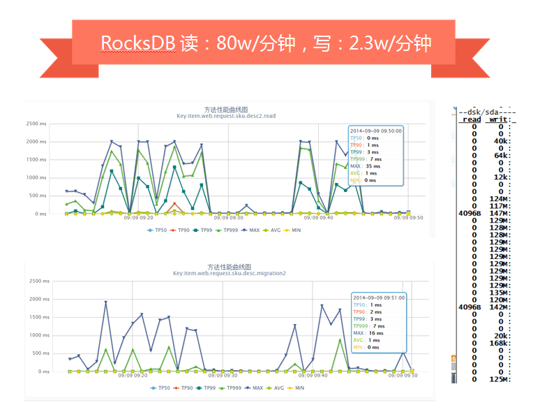 RocksDB是改造自LevelDB,对SSD做了优化,我们压测时单独写或读,性能非常好,但是读写混合时就会因为归并产生抖动。