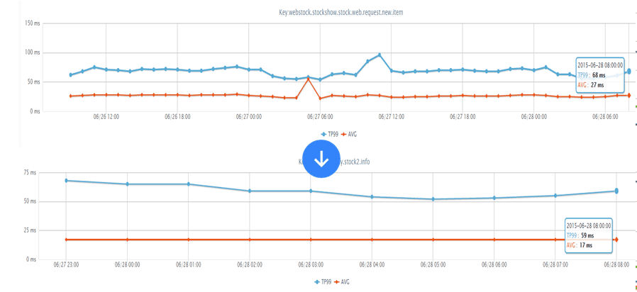 如下服务是在抖动时的性能,老服务TP99 211ms,新服务118ms,此处我们主要就是并发调用+超时时间限制,超时直接降级。
