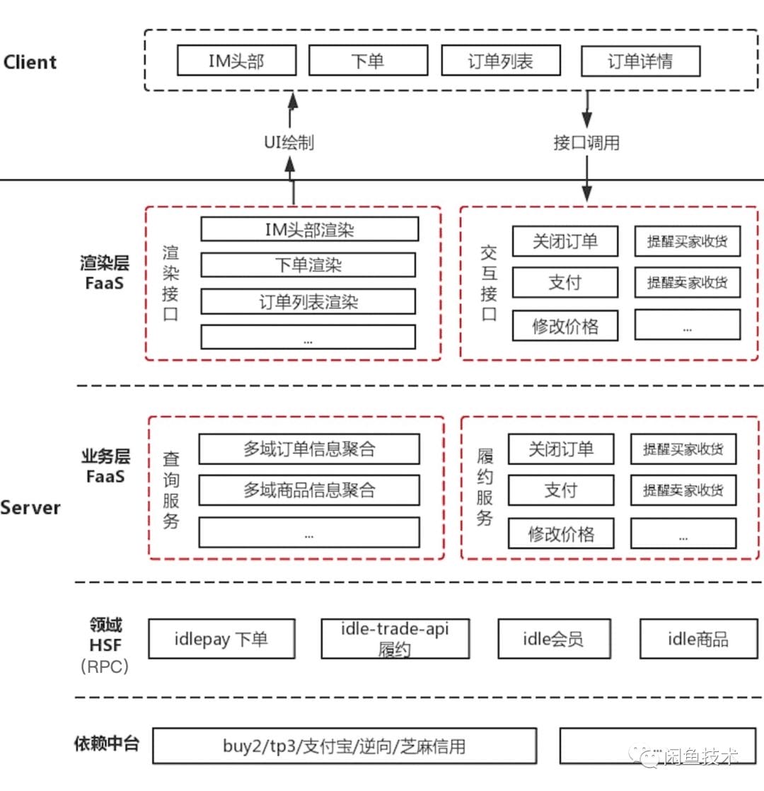 此时,服务端仍分为3层:底层数据模型、闲鱼C2X交易域、业务层。业务层包含业务解决方案、页面渲染解析。客户端上仅保留渲染层。