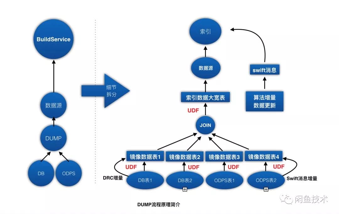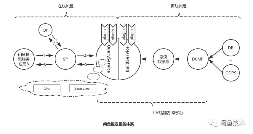 - ② DUMP: 我们把索引数据的生成过程称作离线DUMP。搜索引擎的全量/增量索引是通过BuildService系统生成的,然后分发给在线部分的Searcher。