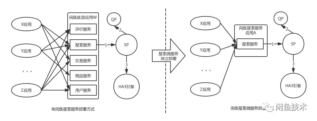 最开始闲鱼搜索服务与其他很多不相关的业务场景共建在一个比较庞大的底层应用中;这种部署方式对稳定性要求很高的业务模块来说有非常大的安全隐患;