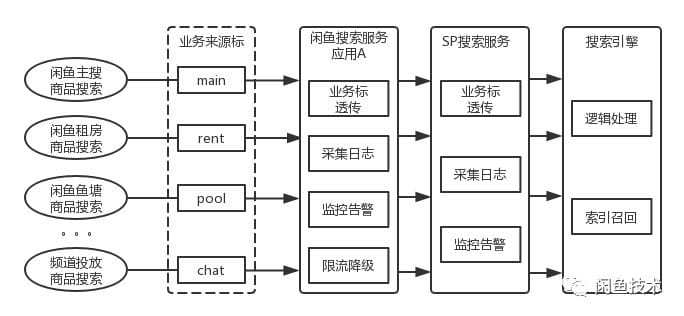 首先必须有Ha3搜索引擎团队在底层提供核心的搜索引擎能力支持;主要负责Ha3搜索引擎核心能力的建设维护;提供并维护引擎运维操作平台和实时引擎搜索服务。 然后是算法团队,在Ha3搜索引擎上进行定制,优化用户搜索体验;对闲鱼非结构化的商品通过算法模型进行理解,预测抽取出结构化信息,供搜索引擎商品索引使用;监控维护QP集群服务;开发并使用Ha3引擎排序插件,进行召回数据分桶实验,验证调优。 最后是我们业务工程团队,串联整个搜索流程,监控维护整个搜索链路的可用性;主要维护搜索对接的数据,Ha3搜索引擎接入管理,进行SP搜索服务编排,制定合理的查询计划;以及闲鱼搜索统一在线查询服务的研发维护工作。 本文亦是从业务工程团队的工作角度出发,阐述如何对复杂搜索业务系统进行稳定性的保障;