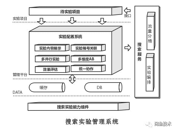 为了解决以上非常重要的问题,业务工程团队开发了一套实验管理系统,用来进行搜索实验灰度调度管理,系统功能如上图所示;其具有以下特点。 * 实验灵活方便,一个实验可以包含多个实验组件,一个实验组件可供多个实验使用;一个实验组件又可以包含多个实验分桶; * 各页面模块的实验都可以在系统中实时调控,包括实验的开/关;以及实验之间的关系处理; * 搜索实验埋点全链路打通,统计各种实验数据报表; * 统计数据接入了闲鱼门户和通天塔,可查看各个指标不同分桶的实验曲线; * 提升实验迭代速度,提升算法/业务效率,快速试错,加速搜索成交转化的增长;