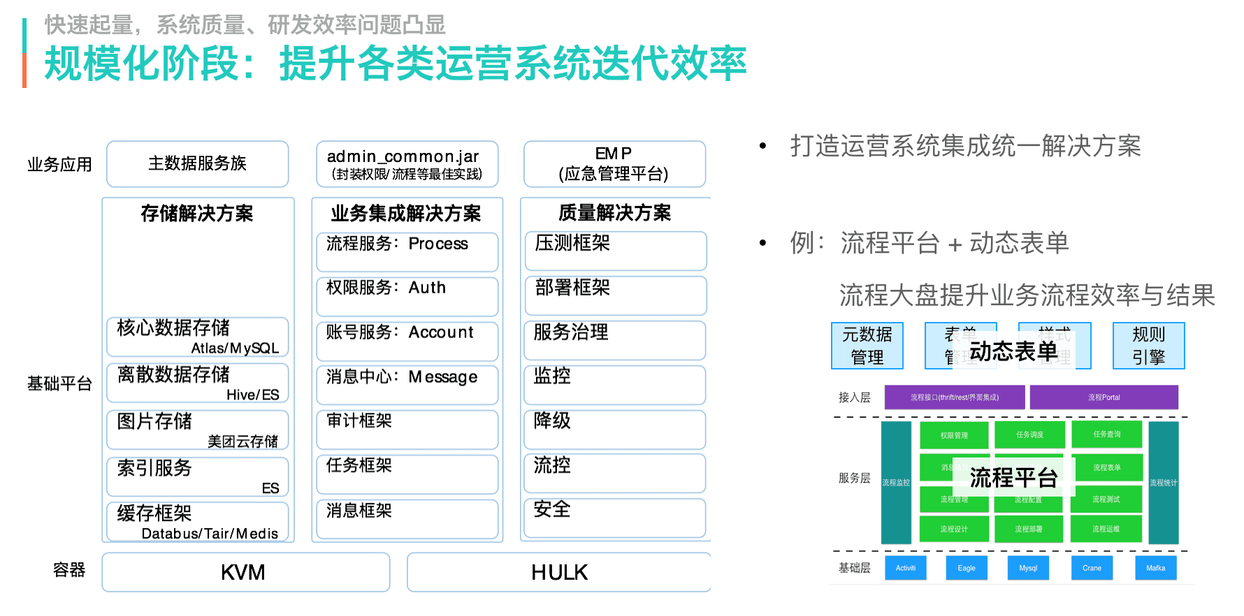 运营系统涉及一个业务运营管理的方方面面,我们在业务领域上除了明确目标、过程、运力、资金四个领域外,打造了一套运营系统集成解决方案集合。研发通过持续投入精力在平台化服务或组件的长期建设上,使每个垂直的运营系统扩展性得到保证,从而不断提升研发效率。以工作流场景为例,通过动态表单 + 流程平台的方式,统一各类业务流、审批流的工程实现,各类管理动作的效率与质量可量化,找到流程阻塞节点,自动化部分流程环节,通过技术手段不断降低人工成本。